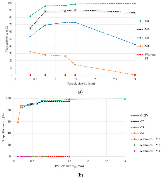 Normalized maximum sediment trapping capacity of the models: (a) 1:1 velocity and sediment scaling (0.5–2 mm); (b) Froude and geometric sediment scaling.