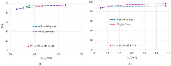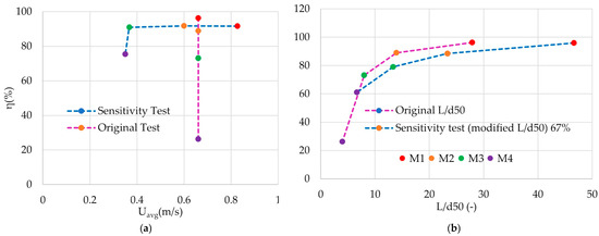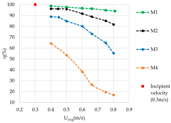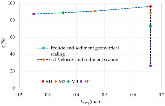 On the other hand, employing Froude scaling in conjunction with geometrical scaling of sediment size, were performed across a matrix of four distinct flow velocities and four varying particle sizes. The results in Figure 11b revealed a consistent trend: trap efficiency increased across all models with increasing sediment size. However, significant flocculation was observed with sediment sizes below 0.375 mm, resulting in suspended particle transport and a corresponding reduction in trap efficiency in M3 and M4. Furthermore, the absence of a sediment trap at the model exits led to a complete loss of trap efficiency in all experimental runs.