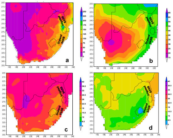 The SASB, extending approximately from 23 to 31° S and 28 to 32.5° E, is characterised by diverse land use types and livelihoods, including vegetation, water bodies, and crop and livestock production. Within this region, large-scale and small-scale sugarcane farmers primarily grow sugarcane for sugar production. This critical agricultural region is highly vulnerable to climate variability and change, which reduces water availability and consequently impacts annual sugarcane yields [16]. The southern African vegetation fraction drops from east–west following rainfall characteristics [24]. In the study area, the Normalised Difference Vegetation Index (NDVI) spectrum ranges between 0.2 and 0.8, but vegetation fraction equal to or greater than 0.6 is predominant [16]. As shown in Figure 1a, monthly mean precipitation over the SASB can reach up to 100 mm/month. A notable spatial difference can be observed, with the irrigated region (e.g., 26.8° S and 31.5° E) appearing wetter than the dryland region (e.g., 30.5° S and 30.9° E) from December to May. This may be partially attributed to rainfall-bearing mechanisms such as tropical cyclogenesis, active over the Mozambique Channel. Despite these heterogeneous seasonal rainfall characteristics between the dryland and irrigated regions of the SASB, the cloud cover fraction (CCF) remains uniform (50%) across the area (Figure 1a,b). A high CCF (50%) was observed over the east coast of South Africa, while a steady decrease was observed from east–west in South Africa (Figure 1b). These meteorological conditions favour sugarcane cultivation, especially in the lowland regions of the country. The top sugarcane-producing provinces in South Africa are KwaZulu-Natal (KZN) and Mpumalanga. However, parts of other provinces (e.g., Limpopo and Eastern Cape) with CCFs of 50% also have minimal contributions towards annual sugarcane yield in the country.