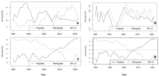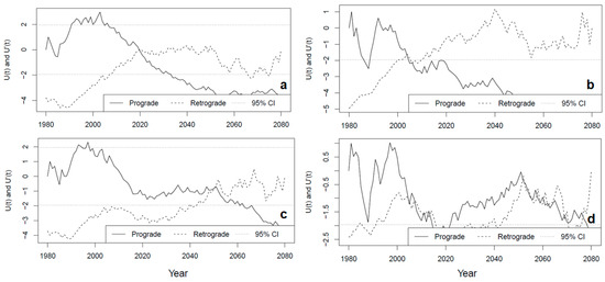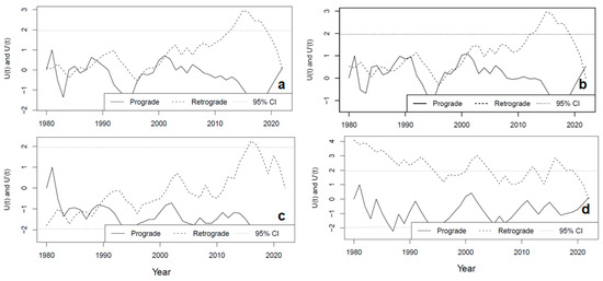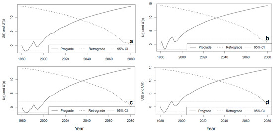 Here, the mmky1lag function for the modified MKTT, version 1.6, was used in this study. This version considers serially correlated data that involves a variance correction approach through using the lag-1 correlation coefficient only [33]. Through this approach, statistics and p-value are recalculated based on corrected and old variances; hence, such robust techniques were desired for this type of research. It can be noted that the modified MKTT and ITA provided useful characteristics of hydroclimatic trends. Those characteristics are magnitude, strength, and direction, but both the modified MKTT and ITA do not indicate when trend changes start and/or end. Therefore, a sequential MKTT was applied to locate potential trend turning points (PTTPs; trend changes). The sequential MKTT uses forward/prograde ) time series and backward/retrograde time series on the same plot to quantify trend characteristics [34]. A PTTP is identified if the intersection between the prograde and retrograde trends is TRUE [34], but the significance of the PTTP is only declared if they diverge beyond threshold. On the other hand, to compare cases of , these are normally counted and represented by so that statistic can be calculated from Equation (12), below: