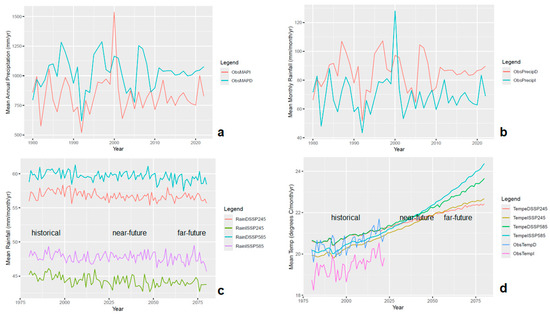 Observed rainfall and surface air temperature trends over SASB from 1980 to 2022: (a) rainfall over dryland region, (b) rainfall over irrigated region, (c) surface air temperatures over dryland region, (d) surface air temperatures over irrigated region.