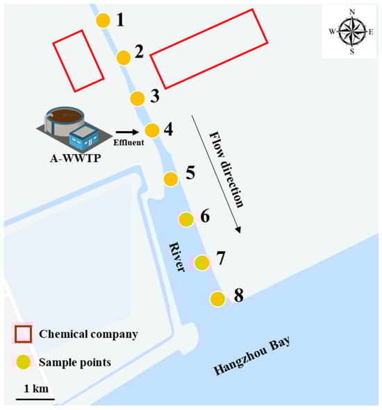 Hangzhou Bay is an important part of the East China Sea, featuring rich biodiversity and significant ecological functions. However, due to the increase in surrounding industrial activities, especially the wastewater discharge from the chemical industry, the water quality and ecosystem of Hangzhou Bay are facing serious threats. This study took the sewage-receiving river of a typical plastic chemical industrial park connected to Hangzhou Bay in eastern China as the research object. More than 65 plastic production and upstream and downstream chemical enterprises have gathered around the river, including the largest plastic pellet production enterprises in Eastern China (accounting for 15% of the total production capacity) and plastic fiber production enterprises (accounting for 20% of the total production capacity). The main products include synthetic resins, plastics, synthetic rubbers, and synthetic fibers, with an annual production of over 42,000 tons of plastic additives (including antioxidants and plasticizers). A WWTP in the region handles surrounding industrial wastewater, with an annual treatment capacity of 9.95 million tons, and discharges treated effluent directly into the receiving river.