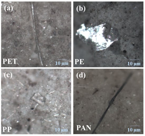 Images of MPs detected by micro-Raman microscopy: (a) polyethylene glycol terephthalate (PET), (b) polyethylene (PE), (c) polypropylene (PP), (d) polyacrylonitrile (PAN).