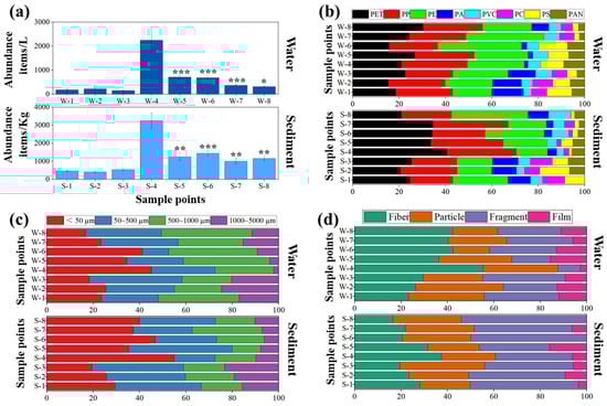 The (a) abundance, (b) type, (c) size and (d) morphology distribution of MPs in water and sediment samples. Note: The significance results at sampling points 5–8 downstream of river water and sediment were compared to the results at sampling point 3 close to the WWTP outlet, * p < 0.05, ** p < 0.01, *** p < 0.001.