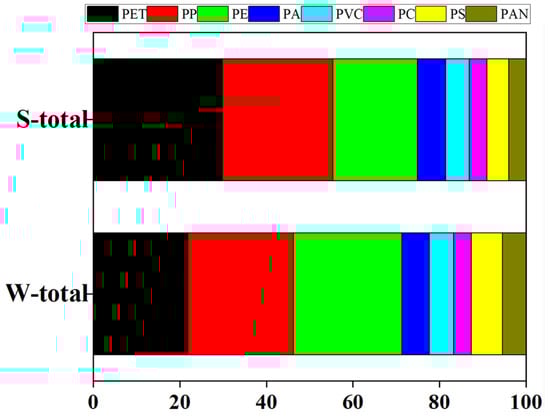The distribution of MP types in water (W-total) and sediment (S-total) samples.