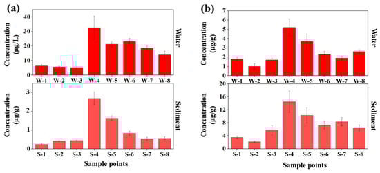 (a) The concentration of DEHP in water and sediment; (b) the concentration of DEHP on MPs in water and sediment.