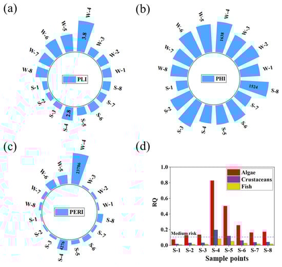 Risk assessment results of (a) PLI, (b) PHI, and (c) PERI for MPs. (d) RQ risk assessment results of DEHP in sediments.