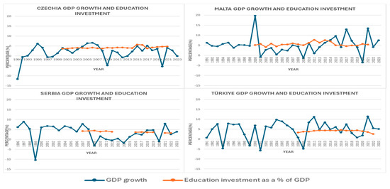 Overview of the GDP growth and education investment in selected countries: Czechia, Malta, Serbia, and Türkiye.