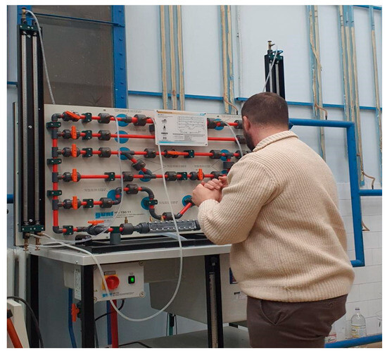 After thoroughly evaluating the existing equipment at the Laboratory of Hydraulic Engineering of the Faculty of Civil Engineering and Architecture at the University of Niš, a laboratory model was selected for the Virtual Reality Learning Environment (ViLE) foundation. This model (Figure 2) is specifically designed to facilitate learning the fundamentals of Fluid Mechanics, providing learners with an interactive way to study the behaviour of fluids in closed conduit systems. The chosen model focuses on pressure losses in pipes, piping elements, and shut-off devices, which are essential concepts in hydraulic engineering and water management.