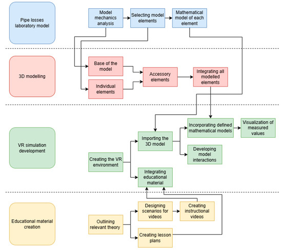 The development of ViLE followed a structured four-stage process, ensuring the accurate digital representation and effective educational integration of the laboratory model. These stages included: (1) analysing the physical laboratory model, (2) constructing a 3D virtual replica, (3) integrating interactive simulations, and (4) designing educational materials to complement the virtual experience. Each stage played a crucial role in developing an immersive and functional VR-based learning platform. These steps can be seen in the following Figure 4.