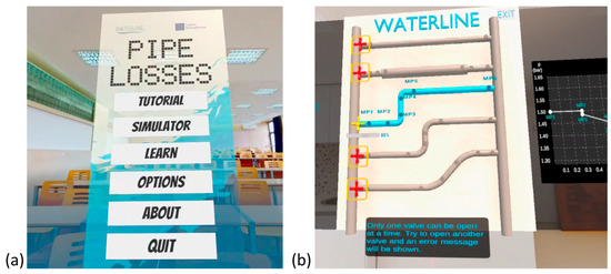 VR application for pipe losses elements: (a) main menu, (b) simulator.