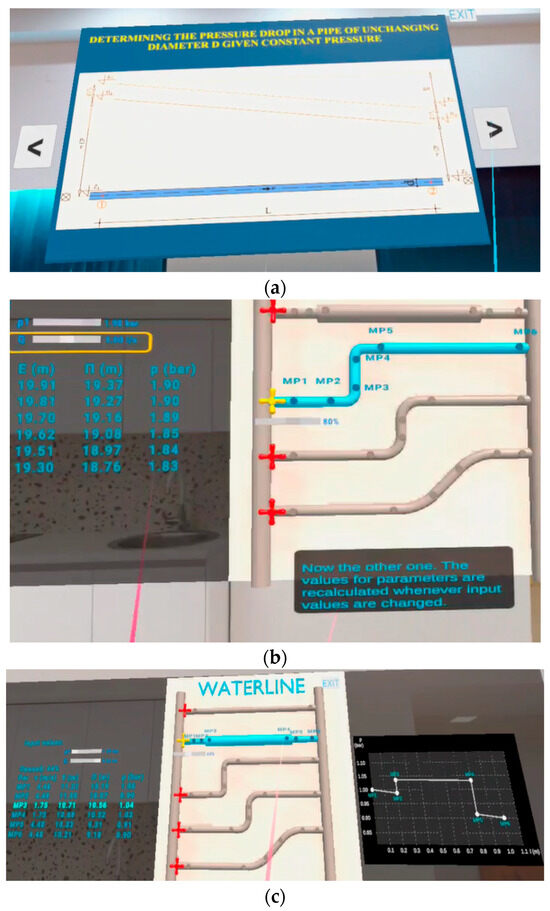 Figure 6. VR application for pipe losses modules: (a) learn, (b) tutorial, and (c) simulation. - (2)