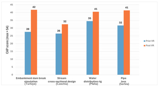 As can be seen from Figure 9, all the applications were very successful and demonstrated substantial improvements in perceived learning after users had experienced the VR application. This proved the educational value of technology, specifically in cases where the usage of VR applications to teach water-related lessons. The user testing results from Phase II of the WATERLINE project further validate the educational value of VR-based learning tools, aligning with the core argument of this study. Specifically, the CAP questionnaire results revealed significant perceived learning improvements across all three domains (cognitive learning, affective engagement, psychomotor skills), particularly in courses on flood management and hydraulic engineering (Figure 10). Students reported stronger conceptual understanding, attitudinal shifts, and enhanced practical skill acquisition following VR use, confirming the pedagogical impact of immersive technologies.