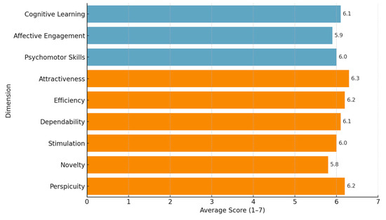 To evaluate the educational impact of the VR application, Phase II of the testing incorporated both the CAP test and the standardised UEQ [45]. Initially, students studied the theoretical content that aligns with the application’s learning objectives. Following this, they received a guided introduction on how to navigate and use the application effectively. The experimental design divided participants into two subgroups: one subgroup completed the CAP test both before and after interacting with the VR application, while the other completed it only after using the app. All participants then engaged with the VR application, after which both subgroups completed the UEQ to assess usability and engagement. This design enabled a comparative assessment of learning outcomes between students who studied theory alone and those who combined theory with immersive VR experiences, offering insights into the added pedagogical value of digital learning tools in enhancing cognitive and affective learning dimensions. Visually, the results can be seen in Figure 9.