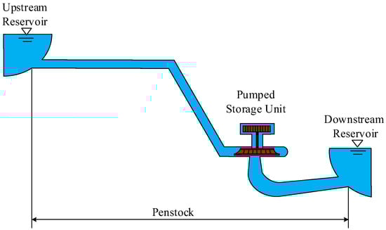 The pumped storage unit governing system integrates hydraulic, mechanical, and electrical operations []. Its subsystems include pressure piping, a pump turbine, a generator, and a governor, as shown in Figure 1. The fundamental equations of each subsystem are as follows.