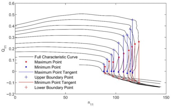 Figure 3 shows the upper and lower boundary points of the SFR. The full characteristic curve shows that with the same guide vane opening when the pump turbine speed is equal to the local maximum value or local minimum value of the speed, the same unit speed corresponds to the two flows. This should be the critical condition for the PSU to enter the SFR during operation. The local maximum point of the unit speed of the pump turbine corresponds to the lower boundary point of the SFR. The local minimum value point of the unit speed of the pump turbine corresponds to the upper boundary point of the SFR of the pump turbine. Therefore, in the full characteristic curve of the pump turbine, the SFR has upper and lower boundary points. These points are found where tangents drawn at the local maximum and minimum operating points intersect the corresponding equal guide vane opening line for each guide vane opening.
