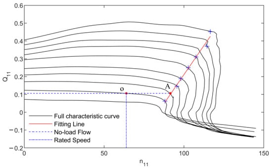 It can be seen from Figure 5 that the upper boundary points of the SFR of the pump turbine are approximately distributed on a straight line. In order to facilitate the study of the positional relationship between the no-load operating point of the PSU and the SFR, the upper boundary points of the SFR of the pump turbine are fitted into a straight line using the least square method.