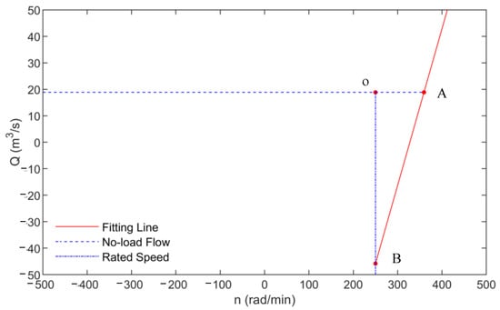 Considering the large order of magnitude difference between unit speed and unit flow, in order to improve the accuracy of describing the positional relationship between the no-load operating point of the PSU and the SFR, use Equations (14) and (15) to convert the straight line in Figure 5 into the straight line in Figure 6.