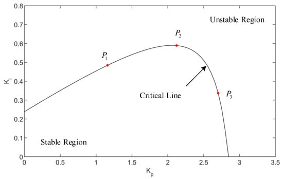 If is regarded as the bifurcation parameter , the stability region of the system can be drawn from the parameter plane, where is taken as the abscissa and as the ordinate. The stable region of the system can be drawn according to Equations (20)–(22), as shown in Figure 7.