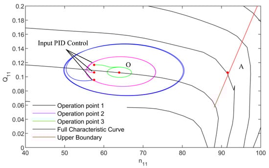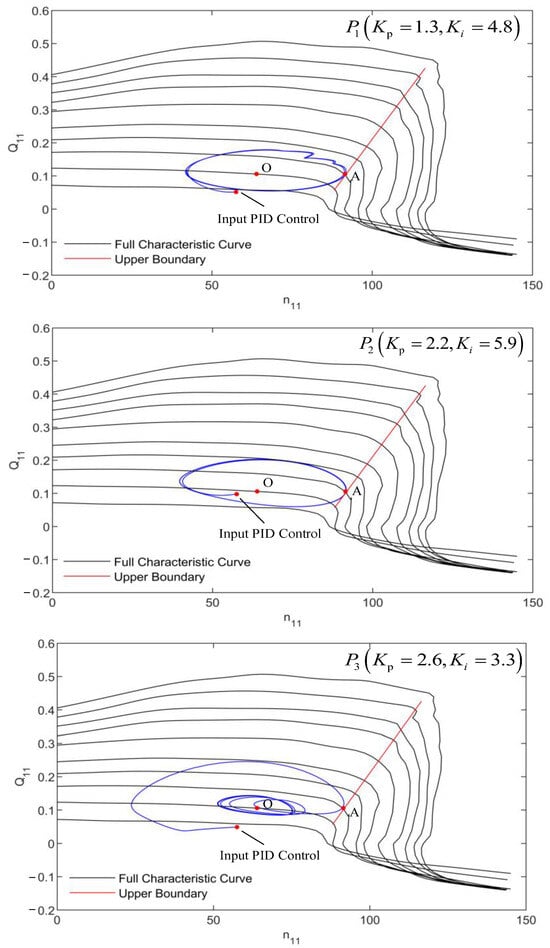 It can be seen from Figure 9 that, after the system input PID control, the trajectory of the full characteristic curve is a limit circle, which also proves the correctness of the Hopf bifurcation analysis above. Among them, the radius of the limit circle generated by the operation point with the large flow is smaller after the PID control is put into operation, that is, the smaller the maximum amplitude of the system is.