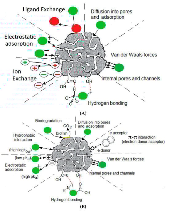 Conceptual illustrations of the possible mechanisms for pollutant removal from stormwater by adsorbents used in the substrate media of treatment systems. (A). Inorganic pollutants [6,25,33,34] (B). Organic pollutants [6,17,25,33].