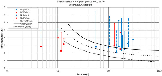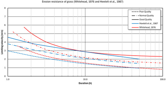 The erosion resistance of grass-covered levees has been extensively studied. Field tests in flow flumes or vegetated spillways were carried out in the United States in the 1940s and in Australia in the 1960s. Additional data on the performance of vegetated cover layers during natural flood events—noting that overflow depth, velocity and duration of overflow during these natural floods were estimated—along with various laboratory experiments involving different types of vegetation, have been compiled into velocity–duration diagrams for three distinct qualities of grass cover (Figure 1): good, normal, and poor [10,11]. A comparison of the velocity–duration curves [12] for the three qualities of grass cover presented in [10,11] concluded that the curves published in [10] derive from the earlier base data and that the curves published in [11] may include a factor of safety since they appear to be more conservative. The original curves “appear to give more appropriate results” in relation to floods of 2007 [12]. More recently, tests assessing the erosion resistance of a cover layer were performed in the UK using a portable erosion measurement device [13]. Additionally, [12] also compares the results of these tests with the erosion performance data presented in [10] and found good agreement between the two datasets.