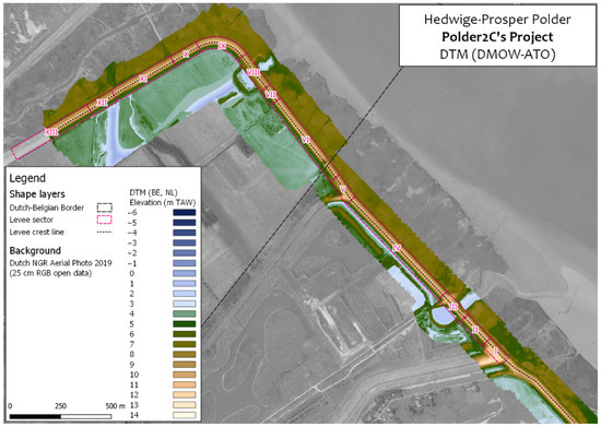 The Hedwige Prosper Polder Living Lab spans 3 km of levee along the Scheldt Estuary, straddling the Belgian–Dutch border. Within this area, several projects were executed, including the Interreg Polder2C’s overflow tests, as described in [22].
