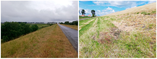 In many countries with moderate climates, levees with a sand core and a grass-covered clay top layer are a common form of embankment and flood protection along rivers and estuaries. Due to climate change, it is expected that current levees may be better or worse adapted to future environmental conditions. Water levels in rivers, estuaries, and coastal areas are subject to change due to various processes, including sea-level rise [1,2], altered precipitation patterns [2,3], and morphological changes [4,5]. Climate change may also intensify or increase the frequency of precipitation events, leading to more extreme water levels along rivers and estuaries. Longer or more frequent drought periods may affect vegetation states [6,7] and induce cracking of the top layer [8], and thus compromise the integrity of the levee’s vegetation cover. These processes may result in more frequent overflow or overtopping events, and levees may exhibit a suboptimal vegetation state. Various measures can be implemented to mitigate the risks associated with rising peak water levels, such as remeandering, depoldering, constructing tidal areas and wetlands along estuaries, or creating flood control areas. In Belgium, for example, the Sigma plan includes a series of flood control areas and tidal wetlands, some of which have already been operational since the 1980s [9]. In such a context, and especially from a levee risk management, economic, and ecological perspective, it is worthwhile to investigate whether it is acceptable for grass-covered levees to experience overflow, and if so, under which conditions.