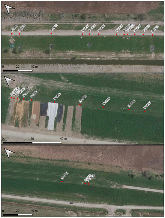 At the start of the Polder2C’s project, an extensive survey was conducted to characterize the properties of the levees [22,23]. This included morphological and surface properties, biophysical, geotechnical, and geophysical properties, as well as sedimentological attributes of the clay cover and the sand core. Survey data are available through the Polder2C’s data platform (https://polder2csknowledge.smartdata2030.com/public_activities/ (accessed on 24 May 2025)). In this paper, we only refer to data relevant for the current scope (see Table 2).