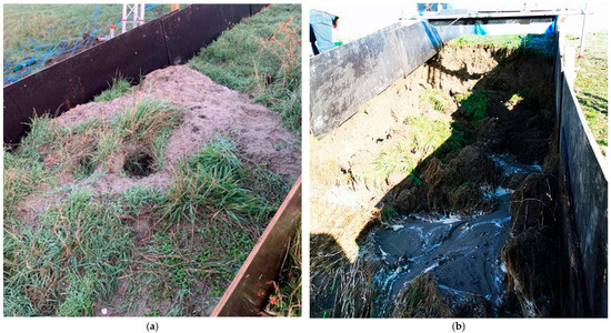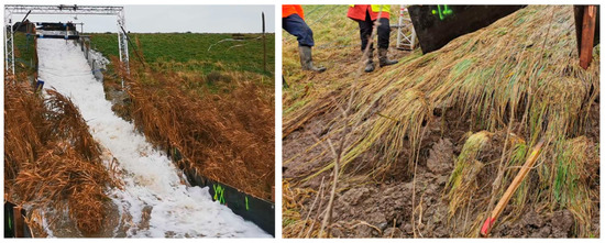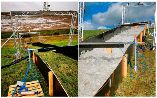 In order to establish a sustained overflow with controlled characteristics on the landward side of the levee, an overflow generator was developed and built at Flanders Hydraulics [30]. The overflow generator was placed on the upper part of the riverward slope, ensuring that the outflow occurred at crest level. The flow crosses the levee crest and flows down the levee slope at the landward side. The flow is contained between plywood boarding walls inserted into slits in the soil to limit leakage. The width of a stream section was typically 2 m, though it was reduced for some tests to increase the specific discharge.
