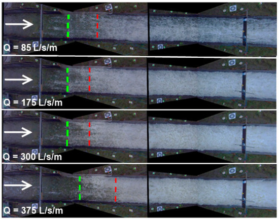 Top view composite images of the flow down the levee crest towards the toe for 4 different specific discharges. The green line indicates the inception of foaming; the red line full turbulence.