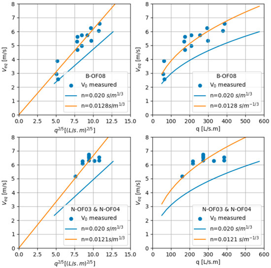 Equilibrium velocity in function of specific discharge. Estimation of the Gauckler–Manning coefficient based on test data on a Belgian section (top row) and a Dutch section (bottom row). Comparison with value of n = 0.020 s/m1/3, recommended in [10].