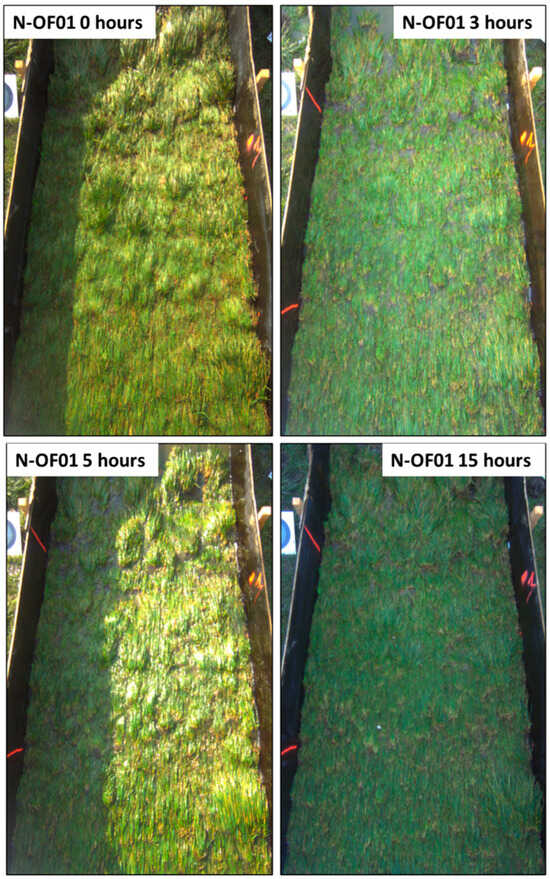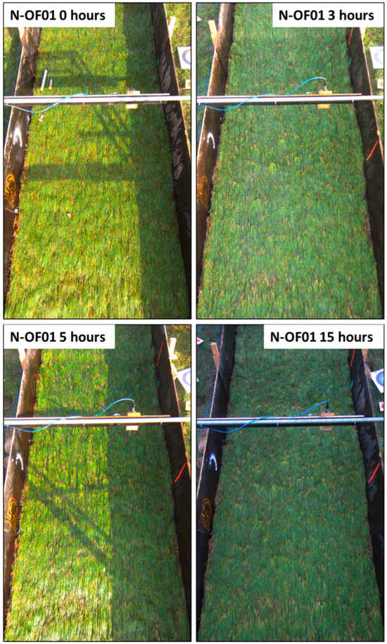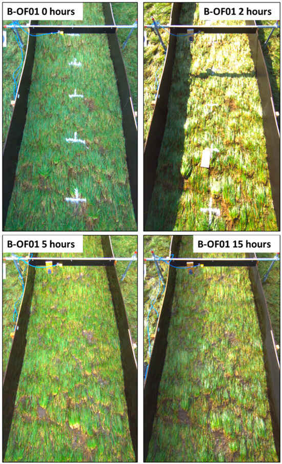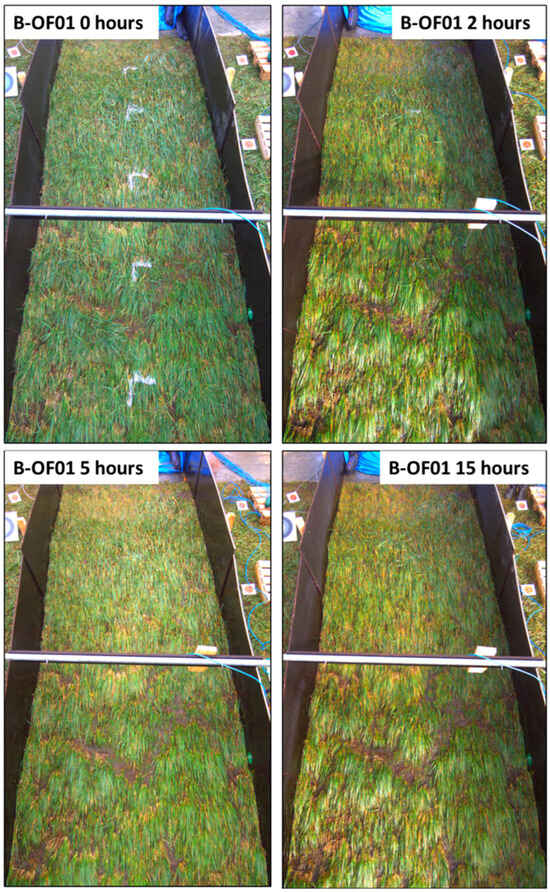 B-OF01. Visual evolution of the grass cover layer quality (Qs = 178 L/s/m) at the upper slope position at 0, 2, 5, and 15 h overflow.