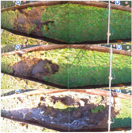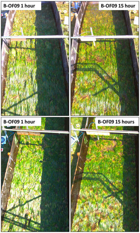 For the Belgian locations, the initial state visually showed lumps of dense grass sods interspaced with barren patches (Figure 9 and subsequent figures). The vegetation coverage varied between 64.8 and 82.1% based on six detailed analysis plots, with a poor-to-mediocre root density [6]. Initially, some loose debris (loose, dried or cut grass) was washed away during the onset of the experiment, and at the same time the grass was flattened by the current so that it formed a continuous cover, resembling shingled rooftiles, over the clay soil. Through time, barren patches became increasingly visible, which was a sign that grass sods were being cut or the soil in between the grass sods was eroded by the overflowing current. This was shown in Figure 9 (upper half of the levee slope) and Figure 10 (lower half), at different time points (0, 2, 5 and 15 h), for test section B-OF01. It showed that poorly grass-covered areas quickly (already after 2 h) evolved towards a more barren state in several patches, which only worsened after more hours. The degradation of the cover layer occurred both at the upper slope and the lower slope. Some more details are provided per section.