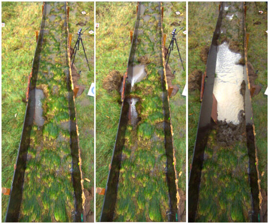 The overflow tests were conducted during daytime for 8 to 10 h per day. The tests were executed in different sessions (blocks) of 1 to 2 h, with only brief interruptions (5 to 10 min) to evaluate the state of the grass cover and detect incipient defects or irregularities. During these interruptions, images were captured with the camera system.