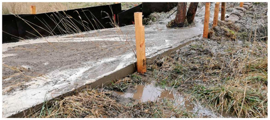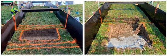 B-OF08 (Figure 11)—The test section was in a visually good state, with vegetation in a condition after normal maintenance, and no visible major anomalies. The test was conducted for 22 h on this section, and relatively little damage occurred. Soil erosion between grass sods was visible and the grass roots became partially exposed. The grass cover layer (as a whole) retained its integrity. Near the levee toe, where the slope transitions into a horizontal surface, more erosion and clay soil exposure was visible (Figure 11). However, here too, no additional damage occurred.