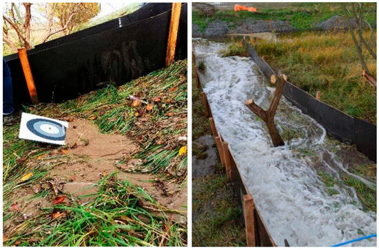 View of the overflow current during N-OF11 (left panel). Detail of the erosion caused at the reed field area in N-OF10 (right panel).