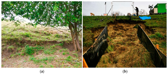 An extensive geotechnical investigation was conducted, describing cone penetration tests and borehole samples, including the soil type, constituents, shear resistance, deformation characteristics, and permeability tests [23,24]. Cross- and inline electrical resistivity profiles and ground-penetrating radar profiles have been acquired at the levee crest, levee toe, and perpendicular to the levee crest orientation [25,26]. Jet erosion tests were performed to assess erosion characteristics of the top soil [27]. Detailed investigation of the burrows and local damages or irregularities was reported in [28].