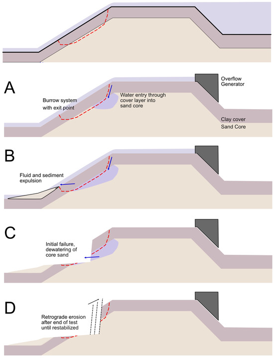 - During overflow, water infiltrates the clay cover and shallow sand core through cracks, animal burrows, or other discontinuities. Burrows may also create a direct path into the sand core. The infiltrating water partially saturates the sand core (Figure 26A).