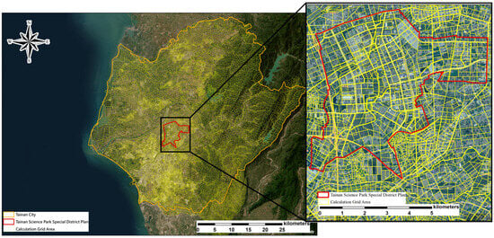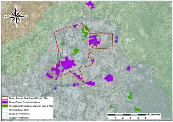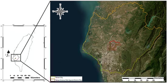 As of February 2025, Tainan City had a total population of approximately 1.86 million, according to statistics from the Bureau of Civil Affairs, Tainan City Government [39]. Both the central and local governments are actively promoting the development of the technology and manufacturing sectors. In 2025, the Executive Yuan introduced the Southern Taiwan Silicon Valley Program, aiming to establish a comprehensive artificial intelligence (AI) industry chain in southwestern Taiwan by integrating the region’s science parks. Among these, Tainan Science Park Special District Plan Area is located at the junction of Shinshih District, Shanhua District, and Anding District in Tainan City, covering an area of approximately 3287.40 hectares.