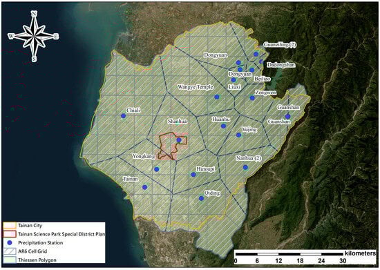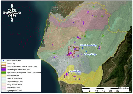 This study focuses on Tainan City, a metropolitan area in southwestern Taiwan. Covering approximately 2191 km2, the city’s topography slopes from east to west, with its coastal regions characterized by alluvial plains and lagoons. Tainan City spans six major river basins, listed from north to south as Bajhang River, Jishui River, Jiangjun River, Zengwen River, Yanshuei River, and Erren River. The city receives an annual rainfall of approximately 1500 to 2500 mm, primarily influenced by the Mei-yu season (May–June) and typhoon events (July–September). Due to the concentration of rainfall within short durations, intense precipitation often leads to flooding.