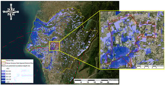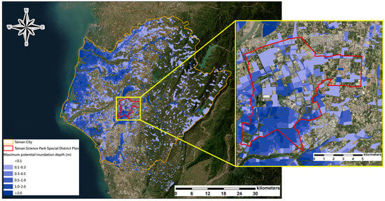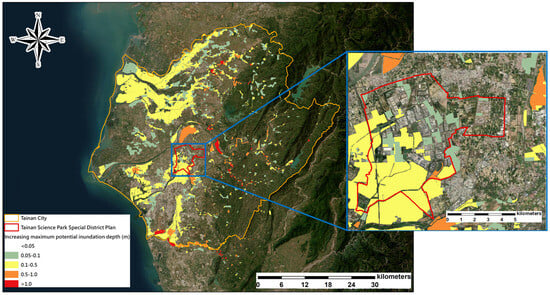 The findings of this study highlight the importance of communication and collaboration between urban planning and hydraulic engineering disciplines. Analysis shows that the southwestern section of Tainan Science Park Special District Plan Area experiences greater flood depths, requiring flood detention measures to enhance mitigation efficiency, especially under climate-change-induced rainfall.