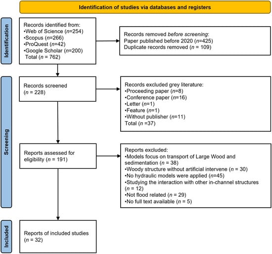 This review aims to compare different representations of woody structures in numerical models and their effectiveness in managing flood risk. Thus, the titles and abstracts of the remaining papers were manually checked, and studies that lacked this research focus were considered irrelevant and excluded through this screening step (n = 159). Studies focusing on the modelling of freely transported large wood, including its movement, formation, or effects on sediment transport, were excluded (n = 38). Moreover, studies that focus more on general flood-related issues and do not specifically target woody structures were also excluded (n = 30). Additionally, studies that assessing the effectiveness of leaky barriers using non-hydraulic modelling approaches, such as before-and-after control impact (BACI), were eliminated (n = 45). Studies employing hydraulic models to examine the interaction between woody debris and existing in-channel structures, such as bridges and reservoirs, were also removed (n = 12). Furthermore, studies investigating leaky barriers but not in the context of flood management, such as those that examined their effects on channel morphology, groundwater recharge, and habitat restoration for invertebrates, were excluded (n = 29). Finally, five articles that did not have their full text available were also excluded. After the screening process, 32 papers were retained. These 32 articles underwent a more in-depth analysis to identify the research trend and progress in the past 5 years.