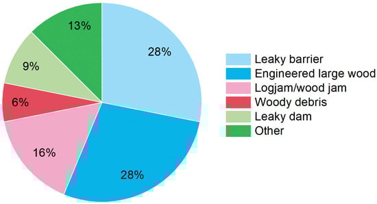 Across the reviewed literature, a variety of terms were used to describe engineered structures intended to mimic the natural accumulation of large woody debris (Figure 3). The most frequently used terms were “leaky barrier” (28%) and “engineered large wood” (28%). Five studies referred to these structures as “logjam” or “wood jam”, while “leaky dam” appeared in three studies, one of which specifically focused on beaver dams. Although leaky barriers differ from beaver dams due to the absence of ongoing maintenance and the intentional design of permeability, their hydraulic behaviours are notably similar []. Due to their temporary water storage capacity, these structures are also categorised in some studied as Runoff Attenuation Features (RAFs) or temporary storage areas (TSAs). For consistency, the term “leaky barrier” is used throughout this paper to refer to all such structures.