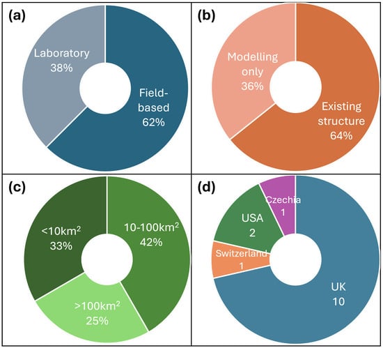 Unlike traditional engineered hydraulic structures, leaky barriers exhibit diverse dimensions and compositions, making their hydraulic behaviours more challenging to characterise [,,]. Consequently, both laboratory and field experiments are often combined with numerical modelling to examine flow dynamics and changes in hydraulic characteristics. Among the 32 selected studies, 20 were conducted in real-world catchments, while 12 were carried out under controlled conditions in laboratory flumes (Figure 4a).