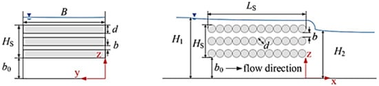 Among the 12 flume studies, two principal methods were employed to physically construct leaky barriers: plastic boards or cylindrical wooden dowels. Leakey et al. (2020) [] utilised a solid plastic plate, while Hart et al. (2020) [] employed a perforated board with uniformly spaced holes to assess the influence of porosity. Field inspections show that leaky barriers are commonly composed of stacked and secured large wood, typically defined as logs with diameter ≥ 0.1 m and length ≥ 1.0 m [,,,,,,,]. To replicate the field-like internal structure of leaky barriers, several studies used cylindrical wooden dowels of differing diameters and lengths (Figure 5). In most cases, these dowels were randomly assembled to simulate natural debris accumulation [,,]. In contrast, a few studies neatly arranged the logs in ordered layers with defined gaps to facilitate observations of internal flow patterns [,].