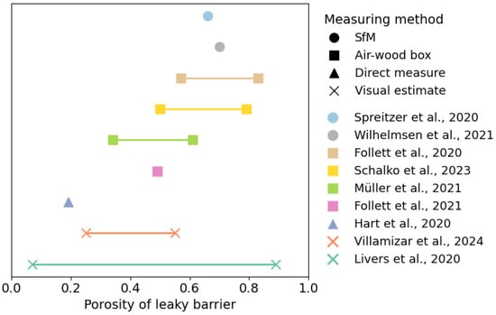 Reported porosity of leaky barriers using different estimation methods (SfM, air–wood box, direct measurement, and visual estimate) [,,,,,,,,].