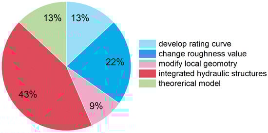 Leaky barriers have been represented in hydraulic and hydrological models using various numerical methods in the reviewed literature, which can be broadly classified into five main groups (Figure 8). Among the 32 included studies, one fifth involve adjusting the surface roughness value, which is advantageous to simulate the cumulative effects of numerous structures without significant computational resources [,,]. Other approaches developed custom rating curves to describe the temporary storage characteristics of leaky barriers, facilitating their implementation within hydrology models [,]. While these hydrological modelling methods were often utilised to study the impacts of leaky barriers at catchment scale, hydraulic modelling approaches were also applied to model flow dynamic around the structures. Modification of the channel cross-section and topography have also been employed to represent installed leaky barriers [,]. However, these geometry modification methods have primarily been applied in field-based case studies, without laboratory validation. The most common method to represent flow through leaky barriers is adopting existing hydraulic structures with adjusted coefficients, such as a sluice gate, weir, or dam. The permeability of leaky barriers in these models is often modelled by adjusting the structural coefficients, which are calibrated through field measurements and laboratory experiments [,,,]. Lastly, theoretical models have been developed to introduce new conceptual parameters to better represent the structures and calculate drag force to investigate energy loss through leaky barriers [,]. This section compares and discusses the advantages and limitations of these representation methods.