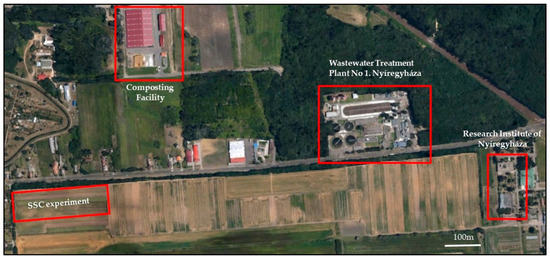 The city of Nyíregyháza has approximately 120,000 residents. Two major wastewater treatment plants co-exist: Plant Number 1 and Plant Number 2, with a 133,000 and 90,000 population equivalent (PE) theoretical maximum capacity, respectively. The compost manufacturing process takes place at a nearby site of Plant No. 1. This is located in the vicinity of the agricultural test field, precisely on the other side of the road. Both treatment plant sludge are transferred to this composting site (Figure 1).