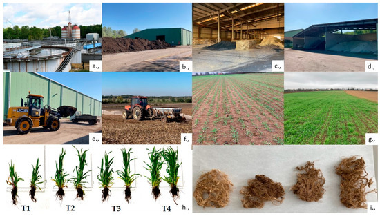 Steps of wastewater treatment and compost utilization. Wastewater treatment Plant No. 1 (a), Composting Facility (b–e), sewage sludge compost application (f), control and 27 t ha−1 treated plots (g), rye biomass (T1: 0 t ha−1, T2: 9 t ha−1, T3: 18 t ha−1, and T4: 27 t ha−1), and root biomass (h,i).
